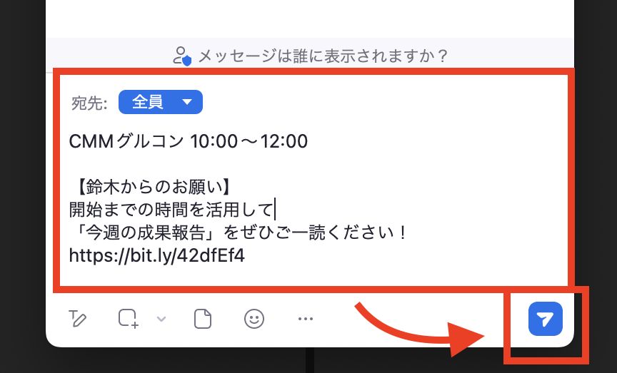 宛先を【全員】に設定し、テンプレ文章(*1)をコピペして送信ボタンをクリックする